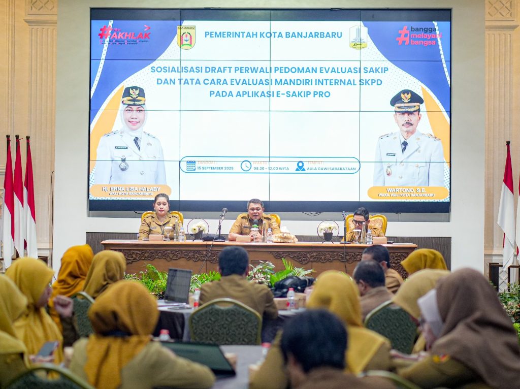 MEDIA CENTER BANJARBARU – Upaya memperkuat tata kelola pemerintahan yang transparan dan akuntabel terus dilakukan Pemerintah Kota Banjarbaru. Senin (15/9/2025), bertempat di Aula Gawi Sabarataan, digelar sosialisasi draft Peraturan Wali Kota (Perwali) tentang pedoman evaluasi SAKIP serta tata cara evaluasi mandiri internal SKPD melalui aplikasi E-SAKIP Pro.