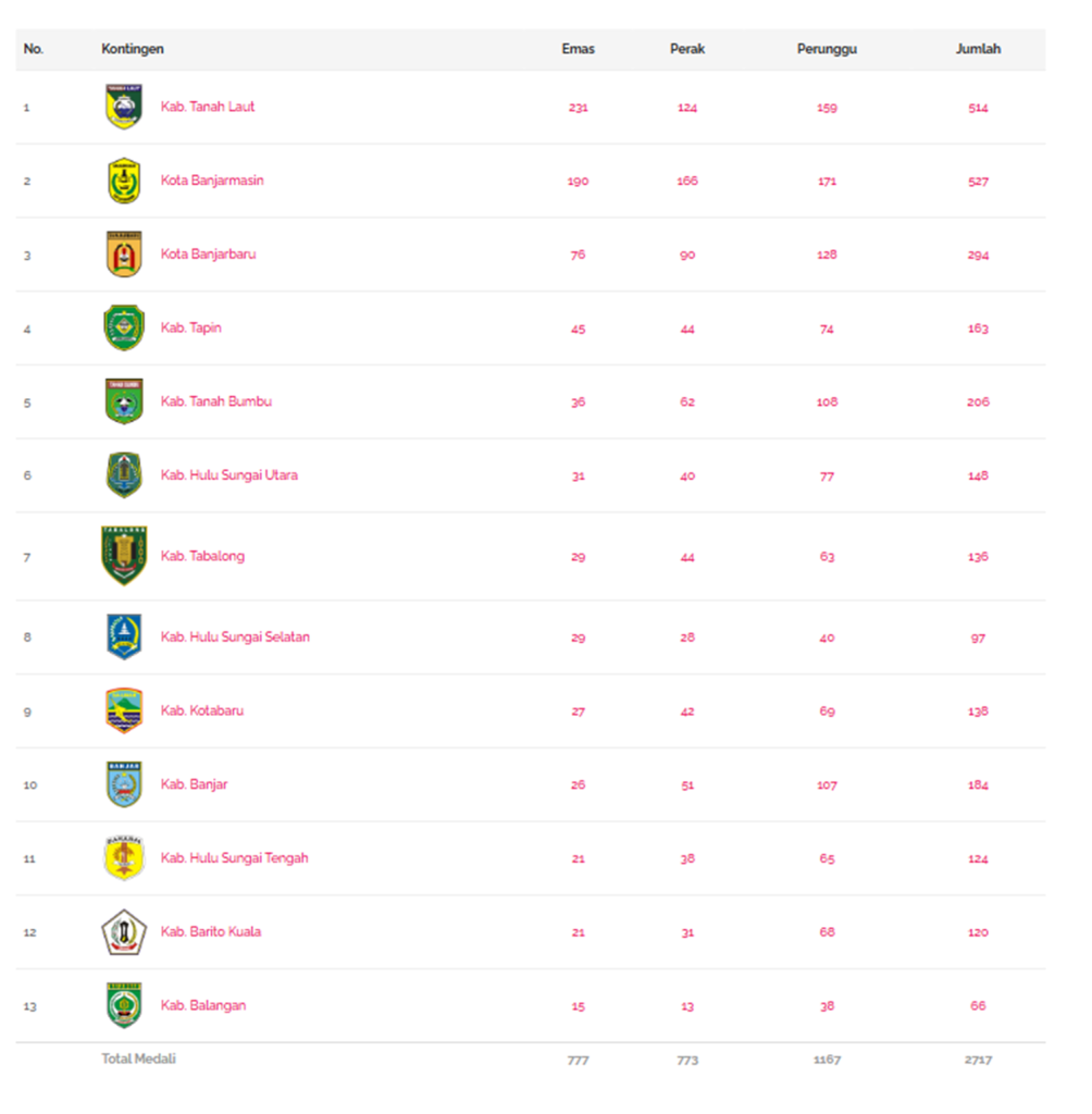 Sementara itu, Kota Banjarmasin menempati posisi kedua dengan raihan 190 emas, 166 perak dan 171 perunggu.